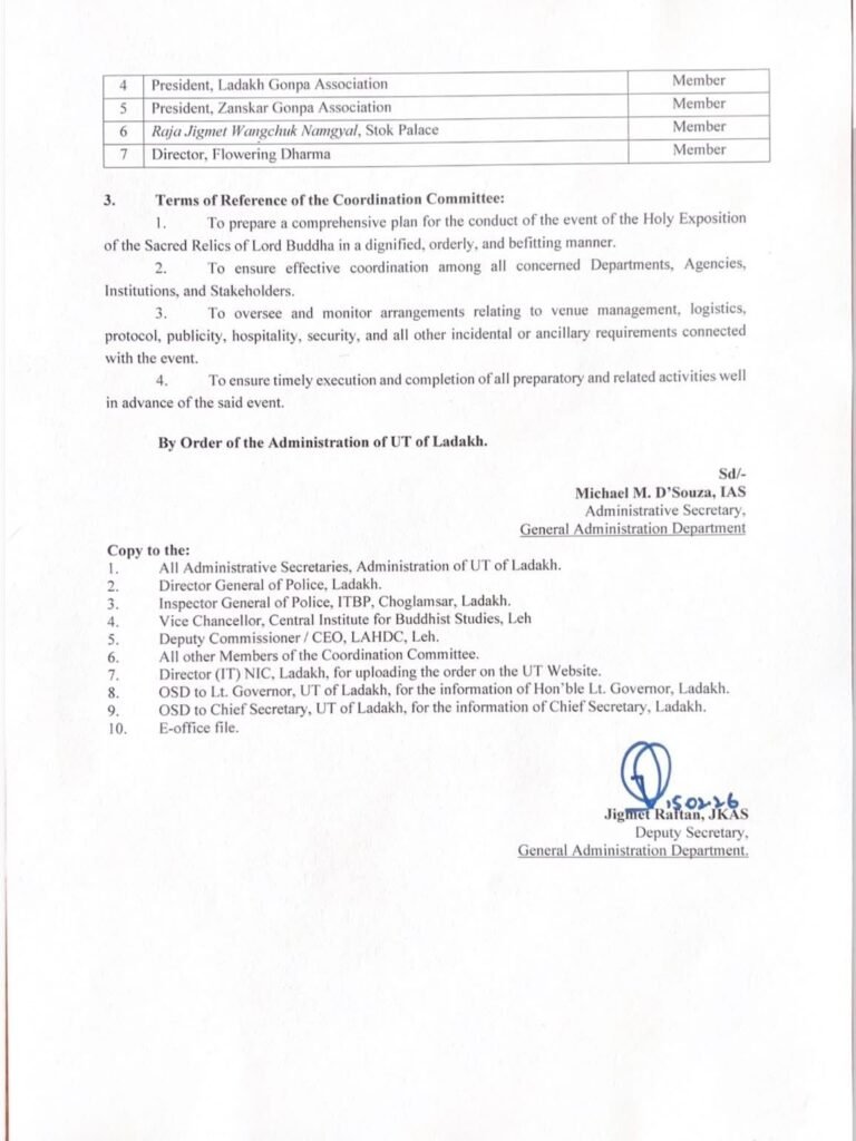 The Chief Secretary highlighted that this rare opportunity to host the sacred relics is a historic occasion for Ladakh, taking place after nearly 70 years. He urged youth, merchants, tourism stakeholders, and the wider community to actively participate in making the exposition a grand success.